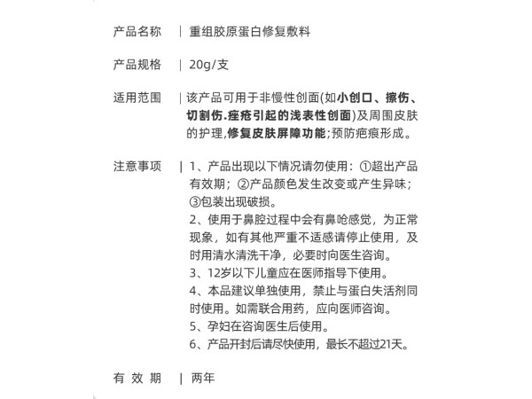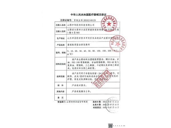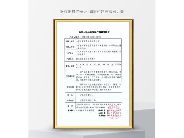 陜械注準20142140018/陜西巨子生物技術有限公司 有效期至:2028-08-19重組膠原蛋白修復敷料