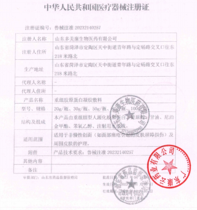 | 山東省醫(yī)用耗材限價掛網(wǎng)數(shù)據(jù) | 重組膠原蛋白凝膠敷料 | 魯械注準(zhǔn)20232140257 | 30g/瓶 | 398.0000 |