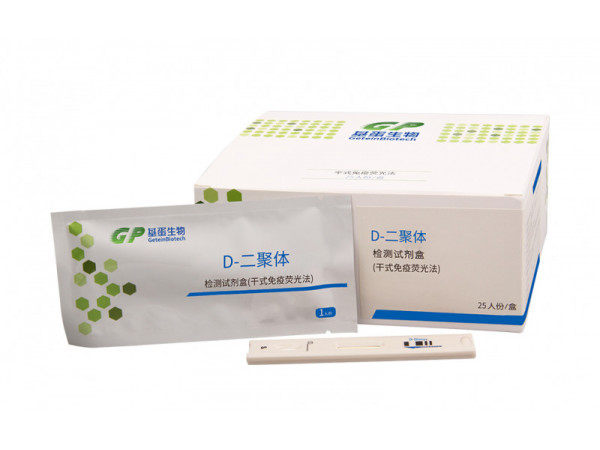 (1)D-二聚體檢測(cè)試劑盒(干式免疫熒光法):內(nèi)含各包裝規(guī)格對(duì)應(yīng)數(shù)量的單人份檢測(cè)卡;檢測(cè)卡由試紙條外殼與試紙條構(gòu)成,試紙條由樣品墊、熒光墊(噴有由熒光標(biāo)記的D-Dimer單克隆抗體I (0.2~0.5)mg/ml)、層析膜(檢測(cè)區(qū)包被有D-Dimer單克隆抗體II(0.5~1.5)mg/ml)和III(0.1~0.3)mg/ml),質(zhì)控區(qū)包被有兔抗鼠IgG抗體(0.5~2.0)mg/ml)、吸水紙、襯墊構(gòu)成(2)說明書:1份/盒;(3)SD卡:Getein1100/1180/1150/1160/200/208配套:1個(gè)/盒,Getein1200/1600/3200/3208/3600/3608配套: 1個(gè)/盒、2個(gè)/盒、3個(gè)/盒、4個(gè)/盒;(4)吸管(Getein1100/1180/1150/1160/200/208配套):選配;(5)檢測(cè)緩沖液(Getein1100/1180/1150/1160/200/208配套):1管/盒、3管/盒、5管/盒、10管/盒、25管/盒、50管/盒、100管/盒,1 mL/管;由磷酸鹽(20 mM)、蛋白穩(wěn)定劑(0.1%防腐劑)、表面活性劑(1.0%吐溫)等組成,pH=7.2±0.2。