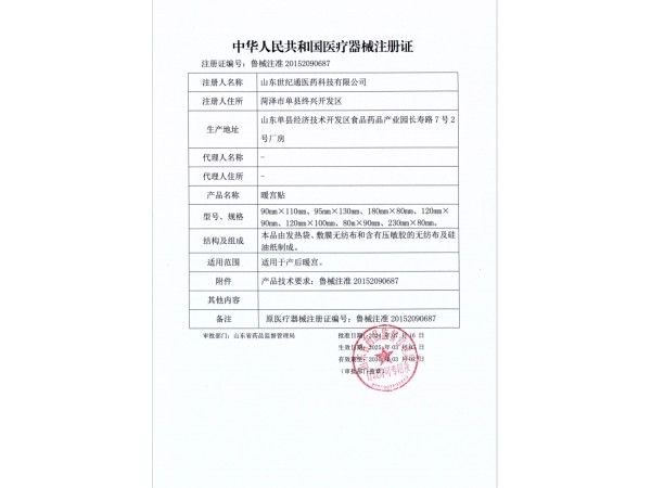 魯械注準20152260320/濟南秦魯藥業(yè)科技有限公司 有效期至:2020-05-18暖宮貼