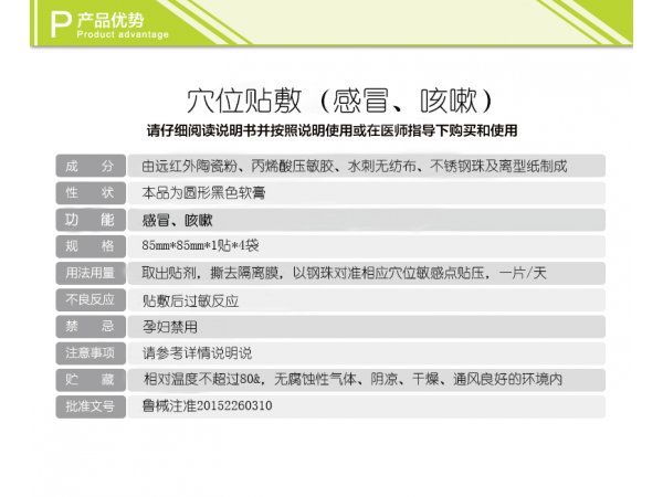 魯械注準(zhǔn)20152260316/濟(jì)南康民藥業(yè)科技有限公司 有效期至:2020-05-18穴位貼敷治療貼