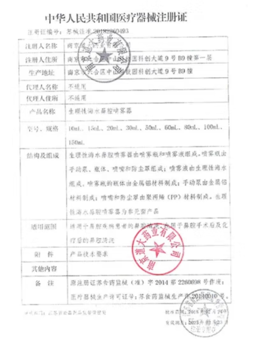 蘇食藥監(jiān)械(準(zhǔn))字2014第2260698號(hào)/南京道大藥業(yè)有限公司 有效期至:2018-05-25生理性海水鼻腔噴霧器