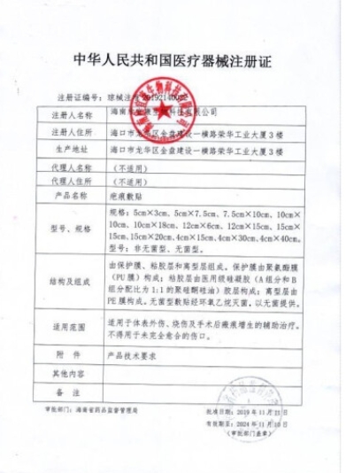 浙械注準(zhǔn)20152640305/浙江省諸暨市珠力神醫(yī)用品有限公司 有效期至:2020-06-02疤痕敷貼
