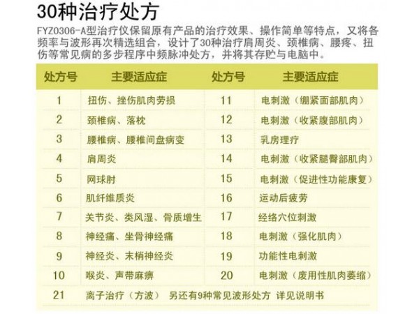 該產(chǎn)品采用了與眾不同的DX數(shù)控技術(shù),設(shè)計(jì)多種波形、多組治療處方,由大規(guī)模集成電路產(chǎn)生各種低頻電信號(hào)對(duì)不同頻率電信號(hào)進(jìn)行調(diào)制,兼容了中頻、低頻治療儀的功效。將低功率激光、電療刺激和紅外熱療技術(shù),分別刺激穴位、肌肉和神經(jīng)感受器,激活下行痛覺抑制系統(tǒng),引起內(nèi)啡肽、P物質(zhì)等血管活性物質(zhì)增加;同時(shí),溫?zé)崮苁咕植垦軘U(kuò)張,改善血液循環(huán),增強(qiáng)滲出物吸收,促進(jìn)局部代謝物的排泄,降低治療部位的肌張力,減輕脊柱、關(guān)節(jié)的僵硬程度,有利于軀體體機(jī)能的恢復(fù)。從而起到鎮(zhèn)痛、解痙、消炎、消腫等治療作用和保健功效。本產(chǎn)品設(shè)有兩組溫?zé)犭娐労鸵唤M激光光療輸出通道?! C(jī)內(nèi)存儲(chǔ)多組專家處方,針對(duì)不同的用途編制而成,使用者可以根據(jù)需要,按‘低頻’鍵或‘中頻’鍵,可自由轉(zhuǎn)換輸出頻率,治療時(shí)安全舒適,患者樂于接受,無副作用和不良反應(yīng)。同是儀器具有功能強(qiáng)大、操作簡(jiǎn)單、易于使用等特點(diǎn)?! ?主工技術(shù)參數(shù)產(chǎn)品型號(hào) ZN-3 產(chǎn)品類別 標(biāo)準(zhǔn)型號(hào)儀器尺寸 260*160*70mm 儀器凈重 1.8kg 電壓 AC220V/50HZ 外部短熔器 250V1A 功率 40VA 紅外熱療溫度 30C-60C 頻率范圍 1HZ-15KHZ 脈沖寬度 20ms-20us 內(nèi)存儲(chǔ)處 "處方一"至"處方五"、"全功能"至"推拿" 工作設(shè)定時(shí)間 10min 20 min 30min 輸出波數(shù) 方波、指數(shù)波、連續(xù)波、密波、起伏波、正弦波輸出組數(shù) 電療兩組、紅外熱療兩組、光療一組顯示 支持顯示,藍(lán)屏43*73mm 語音 支持語音,真人發(fā)音安全類型 回II 類 BF型設(shè)備 2\中頻電的特性無電解作用:中頻電作用人體的電極沒有電解反應(yīng)、沒有酸堿物產(chǎn)生,對(duì)皮膚的刺激性較小,患者可以多個(gè)療程治療各保??;刺激作用,由天中頻電的頻率在1000HZ以上,每個(gè)脈沖周期刺激已不能引起哺乳動(dòng)物運(yùn)動(dòng)神經(jīng)一次興奮所以它對(duì)皮膚感覺神經(jīng)刺激性低,治療時(shí)電流強(qiáng)度大而不引起疼痛;熱作用,中頻電流作為傳導(dǎo)電流在人體組織中傳導(dǎo),由于歐姆耗損而產(chǎn)生熱;作用深度,中頻電流通過組織的電阻明顯低天頻電,電流作用深度增大,可治療深部組織(骨骼?。┎∽?。中頻電流的作用。鎮(zhèn)痛、止痛作用中頻電療后,在人體內(nèi)產(chǎn)生內(nèi)啡肽等鎮(zhèn)痛物質(zhì)和掩蓋效應(yīng),有不同程度的鎮(zhèn)痛、止痛作用,可持續(xù)數(shù)分鐘到數(shù)小時(shí);促進(jìn)血液循環(huán);能使小血管、毛細(xì)血管、淋巴管擴(kuò)張,作用后可見局部開放的毛細(xì)血管數(shù)目明顯增多;消炎、消仲;中頻電流作用局部能改善血液循環(huán)及微循環(huán),炎癥產(chǎn)物的吸收和運(yùn)動(dòng)的加加速,局部組織的營養(yǎng)和代謝增強(qiáng)對(duì)一些慢性非特異性炎癥有較好的治療作用;電流作用深度比較大,對(duì)骨骼肌有治療作作:中頻電流常用于鍛煉肌肉、預(yù)防肌肉萎縮、5.提高平滑肌張力,調(diào)整植物神經(jīng)功能。 6軟化疤痕,松解粘連:中頻電流有較好的軟疤痕,松解粘連作用,這是由于中頻電刺激肌肉收縮收放松,使粘連的結(jié)締組織纖維、肌神經(jīng)、神經(jīng)纖維等活動(dòng)而后分離,大量臨床資料證明,只要堅(jiān)持治療,中頻電流能較好地促進(jìn)疤痕組織軟化吸收,對(duì)瘢痕組織的異常擴(kuò)張血管能較快地促進(jìn)其收縮,對(duì)腸粘連和瘢痕粘連也有良好的松解作用。 7.等幅中頻正弦電流能促進(jìn)血腫和注射后硬結(jié)消散吸收;離子導(dǎo)藥;等幅中頻正弦電流經(jīng)整的直流電可提高生物膜的通透性,使藥物有效成分藥離子8.迅速擴(kuò)散有效成分藥離子迅速擴(kuò)散滲透生物膜,促進(jìn)藥物入體內(nèi)。激光物征高方向性:發(fā)散角是衡量光線從光源發(fā)出后能否平行前進(jìn)的一個(gè)指標(biāo),而激發(fā)則是集中在一下很小的角度內(nèi)發(fā)光,發(fā)散角很小,所以成束性和指向性特別好。高亮度;激光是目前最亮的光源,其能理高度集中;高單色性;激光為受激輻射引起的光,頻率單一,光譜單純。、相干性好;激光的光束中光線方向、頻率和波動(dòng)位相同,即為相干相好的光。作用特點(diǎn)。消炎;小功率激光能使白細(xì)胞吞噬牟增加,還能促進(jìn)腎腺皮質(zhì)腺的代謝,均有利于消炎;、改變血流變指標(biāo),改善血液收縮、擴(kuò)張,可以降低血壓、全血黏度、血漿黏度、血小板聚集能力激活酶系統(tǒng),加快新陳代謝。刺激交感神經(jīng),可使黏膜血管收縮、擴(kuò)張,凈化血液,從而反射性地引起顱內(nèi)血液循環(huán)和全身血液循環(huán)促進(jìn)上皮生長;小功率激光能促進(jìn)上皮細(xì)胞生和血管的再生 恢復(fù)紅細(xì)胞正常狀態(tài);經(jīng)激光照射,能迅速地補(bǔ)充紅細(xì)胞的生物能量,剝離紅細(xì)胞的脂肪層,使紅細(xì)胞表面恢復(fù)正黨功能。增強(qiáng)血紅細(xì)胞SOD含量,用低強(qiáng)度激光治療后紅細(xì)胞內(nèi)的SOD含量增加,同時(shí)能清附血液中的自由基和垃圾;穴位治療;小劑量激光照射穴位可穿透皮膚直接作用于神經(jīng)末梢的