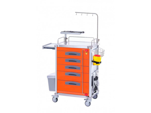 鋼塑搶救車規(guī)格型號:685×445×900mm產(chǎn)品特性:1:主體材料采用鋼塑件;2:適用于病區(qū)急救護理;3:臺面為兩側(cè)平拉開,內(nèi)側(cè)有活動式48格藥盤,可取出,每格有標簽插槽;4:下部有雙開門,內(nèi)側(cè)有一層活動擱板;5:左側(cè)配有工程塑料扶手;6:底部4只高性能聚氨酯靜音腳輪(其中兩只帶剎車裝置);木箱包裝。