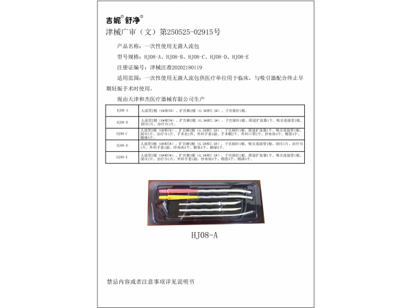 型號規(guī)格:HJ08-A、HJ08-B、HJ08-C、HJ08-D、HJ08-E適用范圍:一次性使用無菌人流包供醫(yī)療單位用于臨床,與吸引器配合終止早期妊