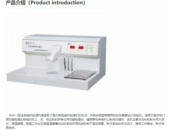 產(chǎn)品標(biāo)準(zhǔn):YZB/津?yàn)I0009-2013產(chǎn)品性能結(jié)構(gòu)及組成產(chǎn)品性能結(jié)構(gòu)及組成:本產(chǎn)品是由制冷臺(tái)、恒溫蠟箱及電器控制系統(tǒng)組成。BMJ-1型生物組織包埋機(jī)為制冷加熱一體式,BMJ-1B型生物組織包埋機(jī)是在BMJ-1型的基礎(chǔ)上將制冷、加熱一體式更改為制冷、加熱分體式。產(chǎn)品性能:1、工作條件:a)環(huán)境溫度:5℃~40℃;b)相對(duì)濕度:不大于80%。2、額定電源:AC220,50HZ。3、開機(jī)后,數(shù)碼管(或液晶屏)顯示正常;電源指示燈亮。4、制冷溫度:在不大于20℃的室溫下制冷平臺(tái)表面中心點(diǎn)的溫度開機(jī)運(yùn)行30min后應(yīng)不高于0℃。5、恒溫箱溫度:在20℃±2℃的室溫下,恒溫箱的調(diào)溫范圍40℃~80℃,溫控精度±5℃。6、在20℃±2℃的室溫下,工作平臺(tái)溫度應(yīng)為:60℃~85℃范圍內(nèi)。7、預(yù)熱槽溫度:在20℃±2℃的室溫下,預(yù)熱槽的調(diào)溫范圍為40℃~80℃,溫控精度±5℃。流蠟裝置應(yīng)暢通,無泄漏,開關(guān)裝置靈敏。9、包埋機(jī)在運(yùn)轉(zhuǎn)的情況下,噪聲應(yīng)小于60dB(A)。其他性能指標(biāo)詳見注冊(cè)產(chǎn)品標(biāo)準(zhǔn)《生物組織包埋機(jī)》。規(guī)格型號(hào):(1)BMJ-1型;(2)BMJ-1B型