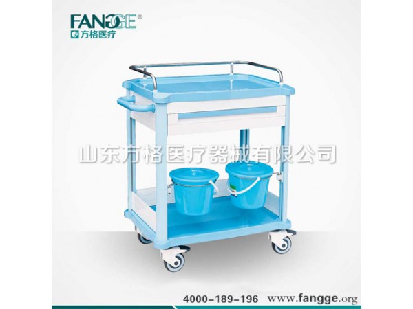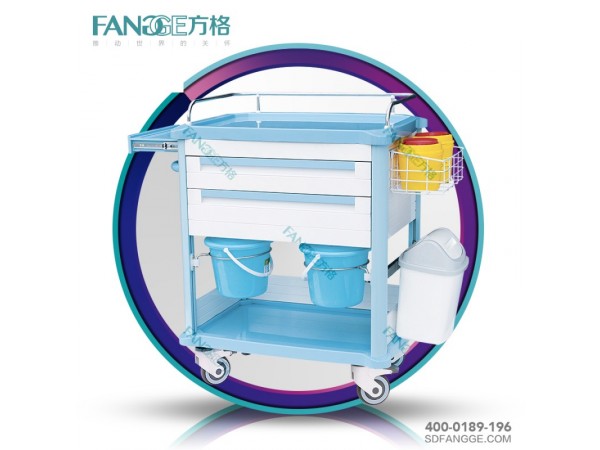 ABS治療車品牌推薦,方格牌治療車型號:FG-E-01尺寸:783*504*860MM1.臺面采用ABS模具成型,車體輕便,容易清潔;上下臺面均配透明軟玻璃。2.立柱采用3MM厚度鋁合金型材,強度高,耐磨抗腐蝕,外形美觀精致;3.抽拉式ABS副工作臺設計,可以延長應用過程中的工作臺面。4.側(cè)板背板選用鋁合金板,不生銹,易清理,車體更輕便,顏色淡雅適合醫(yī)院環(huán)境。5.臺面均安裝不銹鋼圍欄,能有效阻擋推動過程中物品的滑出。6.兩個ABS抽屜,一個20格淺抽屜(內(nèi)部高度5CM),一個20格深抽屜(內(nèi)部高度12.5CM)。抽屜內(nèi)部有自由插片,可以隨意組合。7.抽屜選用高強度三節(jié)靜音滑軌,推拉順暢,安靜,無噪音,承載量大,可自鎖;8.底部四只靜音防纏繞高級靜音腳輪,雙剎車腳輪直徑Φ100mm,推行靈活承載量大。9.兩只污物桶可以300度旋轉(zhuǎn),側(cè)面配備下放置垃圾桶。都可以輕松摘離。10.左側(cè)有ABS推手,右側(cè)配備消毒液銳器桶網(wǎng)籃。