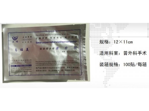功能:本產(chǎn)品《釹鐵硼永磁速愈貼》主要用于外科手術(shù)切口的護(hù)理,具有止痛、消腫、促進(jìn)傷口愈合、防止粘膜粘連、減少疤痕的作用。