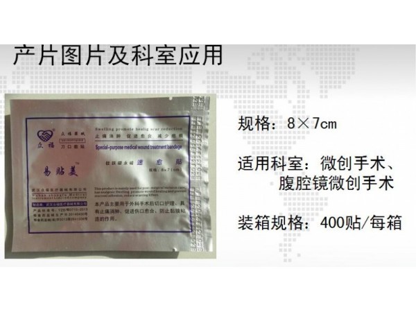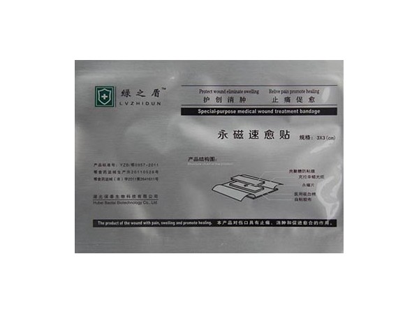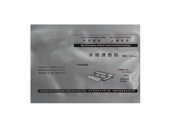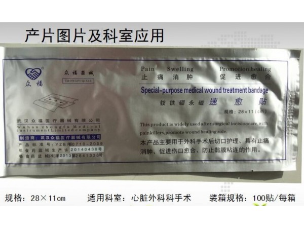 【產(chǎn)品名稱(chēng)】永磁速愈貼【商 品 名】護(hù)創(chuàng)止痛速愈貼【適用范圍】該產(chǎn)品對(duì)傷口有止痛、消腫和促進(jìn)愈合的作用。【產(chǎn)品結(jié)構(gòu)組成及性能】:本產(chǎn)品由醫(yī)用吸血棉 、永磁片、殼聚糖防粘膜、透氣自粘性膠布或棉質(zhì)腰帶組成。永磁速愈貼采用殼聚糖防粘膜,吸血棉吸水量達(dá)到自身重量的10倍以上,重金屬不超過(guò)百萬(wàn)分之十,表面剩余磁感應(yīng)強(qiáng)度為150mT~350mT。磁片極性配列為同名極配列,與皮膚接觸面為N極面。在烘箱內(nèi)試驗(yàn)期間,貼于不銹鋼板上粘貼部的頂端下滑不超過(guò)2.5mm。剝離強(qiáng)度為粘貼部每1cm寬度所需的平均力不小于1.0N,無(wú)菌,一次性使用?!拘吞?hào)規(guī)格】3×3cm、4×4 cm、6×5 cm、12×5 cm 、18×5 cm、22×5 cm、28×5 cm、35×5 cm等8種規(guī)格(特殊規(guī)格按合同訂單生產(chǎn))。【禁 忌 癥】 (1)本產(chǎn)品不宜貼在頭部;(2)本產(chǎn)品的磁效應(yīng)對(duì)心臟起搏器等有源植入物工作有影響,因此不能用于有源植入物術(shù)后傷口;(3)嚴(yán)重的心、肝、肺、腎衰竭的患者禁用;(4)孕婦慎用;(5)對(duì)磁療有明顯不良反應(yīng)者禁用;【滅菌方法】 鈷60射線滅菌?!居?效 期】 有效期二年【 儲(chǔ) 藏 】 干燥、陰涼處保存。【使用方法】 選擇合適規(guī)格,剪開(kāi)密封口,取出貼于縫合后傷口上及患處;根據(jù)不同部位由醫(yī)生指導(dǎo)使用。