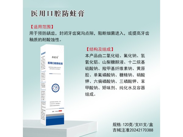 【產(chǎn)品名稱】醫(yī)用口腔防蛀膏【產(chǎn)品規(guī)格】100g/支、120g/支 (代加工可自定義產(chǎn)品規(guī)格)【注冊證號】吉械注準(zhǔn)20252170207【產(chǎn)品用