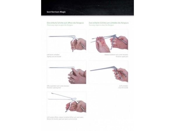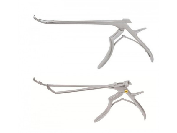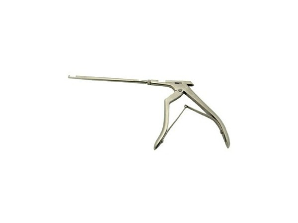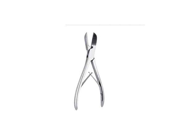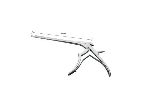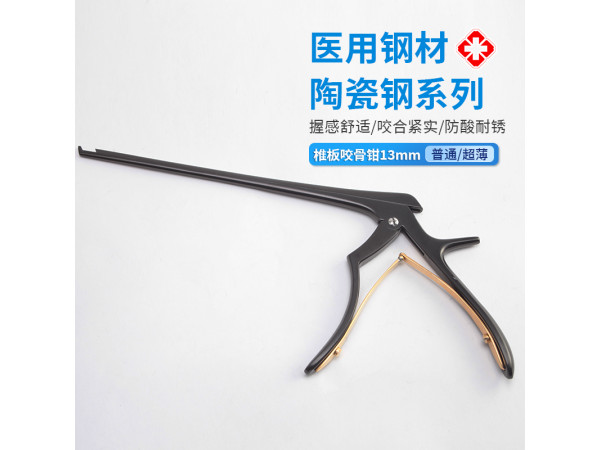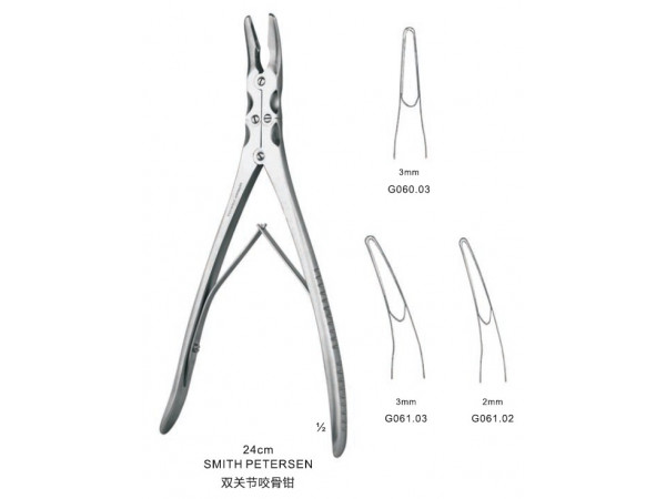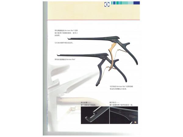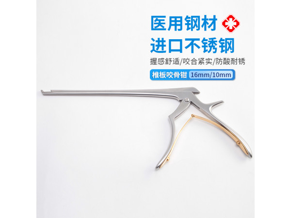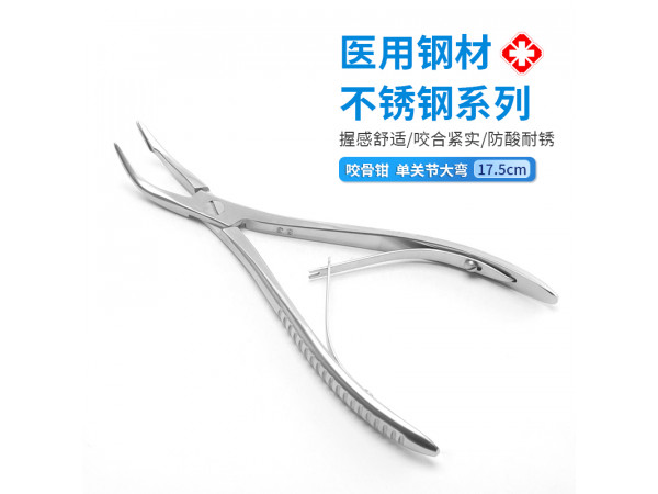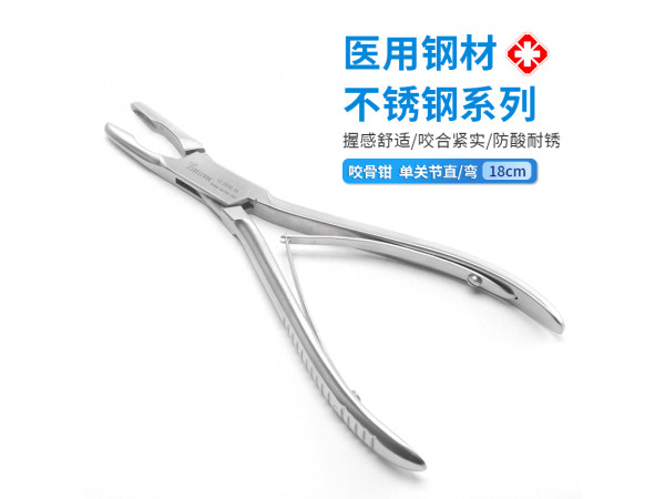 由鉗柄、鉗頭、彈簧片和鰓軸螺釘組成,型式可有單關(guān)節(jié)、雙關(guān)節(jié)、顱骨。其中單關(guān)節(jié)咬骨鉗鉗頭可分為直型和角(前)彎型,雙關(guān)節(jié)咬骨鉗鉗頭有直型、角(前)彎型和棘突型。頭部通常采用不銹鋼材料制成??芍貜?fù)使用。