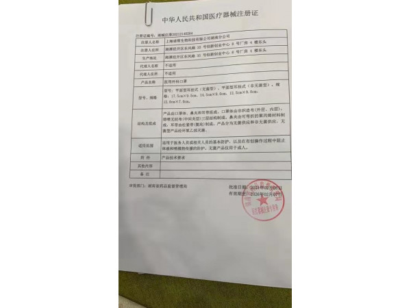 產(chǎn)品標(biāo)準(zhǔn):YZB/鄂0734-2014產(chǎn)品主要性能結(jié)構(gòu):外觀應(yīng)手感柔軟、薄厚均勻、無臭、無味、平整及無破損;口罩的基本尺寸應(yīng)符合產(chǎn)品注冊(cè)標(biāo)準(zhǔn)規(guī)定;口罩帶和鼻夾長(zhǎng)度應(yīng)符合產(chǎn)品注冊(cè)標(biāo)準(zhǔn)規(guī)定,鼻夾長(zhǎng)度11cm(±1cm);口罩帶拉力強(qiáng)度應(yīng)能承受不小于1N的拉力;酸堿度(PH值)應(yīng)在5-8之間;熒光物不應(yīng)顯強(qiáng)藍(lán)色熒光;紗布口罩折疊與縫制應(yīng)按表注冊(cè)標(biāo)準(zhǔn)規(guī)定折疊成型、無切邊外露、四周縫合,層數(shù)相符;外來纖維只允許偶爾有少量孤立的外來纖維存在;普通級(jí)產(chǎn)品微生物指標(biāo):細(xì)菌菌落總數(shù)應(yīng)不大于200cfu/g;真菌菌落總數(shù)應(yīng)不大于100cfu/g;大腸菌群,致病性化膿菌不得檢出。無菌級(jí)產(chǎn)品應(yīng)無菌;環(huán)氧乙烷殘留量:應(yīng)不大于10ug/g.組成::A)無紡布型:無紡布和過濾布經(jīng)折疊、熱合壓片、裁切、點(diǎn)焊松緊帶、整理而成,包含掛耳式和綁帶式.B)脫脂紗布型:脫脂紗布和口罩帶縫制整理而成。規(guī)格型號(hào):型號(hào):無紡布型和脫脂紗布型。無紡布口罩規(guī)格:10~20cm×9~12cm--(2~5)層脫脂紗布口罩規(guī)格:10~20cm×9~14cm--(12~20)層.