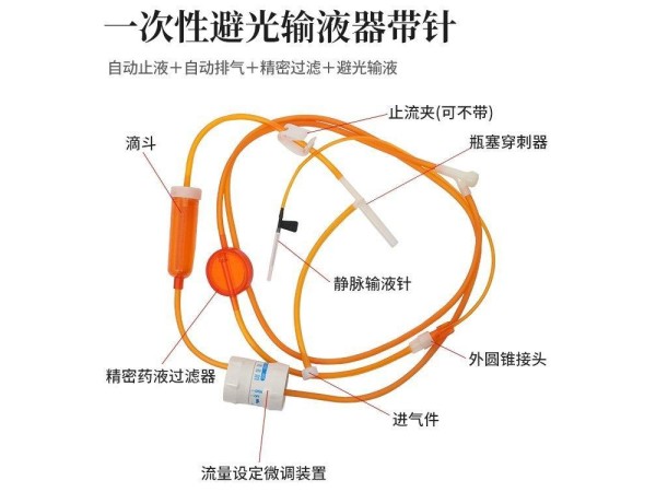 本產(chǎn)品由瓶塞穿刺器、滴斗、導(dǎo)管、流量調(diào)節(jié)器、藥液過濾器、錐頭等組成,帶有或不帶有一次性輸液針。輸液器材料為PVC和避光劑。避光性能:290~450nm波長范圍內(nèi)的光的透光率:滴斗≤35%;軟管≤15%。