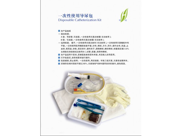 產(chǎn)品標(biāo)準(zhǔn):YZB/蘇0913-2012一次性使用導(dǎo)尿包產(chǎn)品性能結(jié)構(gòu)及組成:一次性使用導(dǎo)尿包按配置不同分為兩種型號(hào),A型由一次性使用導(dǎo)尿管(有球囊)、一次性使用引流袋(1000ml或2000ml)、球囊充起器(10ml~20ml)、碘伏消毒棉球、石蠟棉球、一次性使用醫(yī)用橡膠檢查手套、一次性使用薄膜手套、硬質(zhì)試管、鑷子、洞巾、包布、治療巾、紗布疊片和治療盤(pán)組成,B型由一次性使用導(dǎo)尿管(無(wú)球囊)、一次性使用引流袋(1000ml或2000ml)、碘伏消毒棉球、一次性使用薄膜手套、硬質(zhì)試管、鑷子、洞巾、包布、治療巾、紗布疊片和治療盤(pán)組成。導(dǎo)尿包應(yīng)無(wú)菌。規(guī)格型號(hào):A型、B型