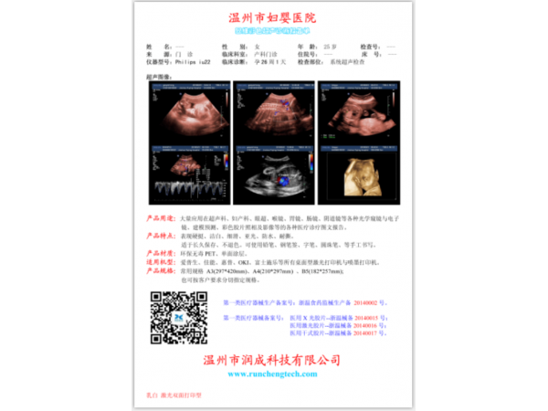 膠片是專用于醫(yī)院彩超成像的彩超醫(yī)用膠片,采用核心技術(shù)MPET材質(zhì)制作而成,具有耐磨、環(huán)保、防潮、可簽字,配合高品質(zhì)打印機和專