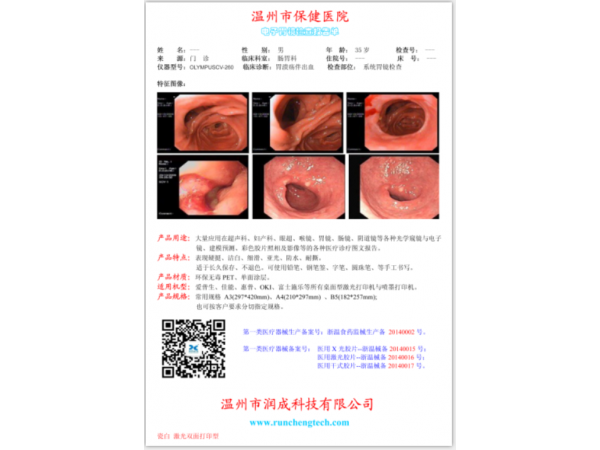 使用范圍:醫(yī)院各科室的圖文報告(B超、眼超、喉鏡、胃鏡、陰道鏡等) 各型光學(xué)及窺鏡圖像、紅外乳腺、乳管鏡檢查。陰道鏡等各型醫(yī)療診療報告 口腔X線一次成像(RVG)、頭顱定位測量攝影、曲面體層攝影(頜全景攝影)數(shù)字化X線攝影(CR)/磁共振掃描(MRI)、數(shù)字化X線設(shè)影(DR)、各型CT圖文、X線攝影圖文 甲基轉(zhuǎn)移酶檢測、病理彩色圖文(可含圖像分析)、各型(檢驗)化驗報告