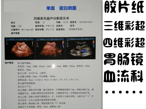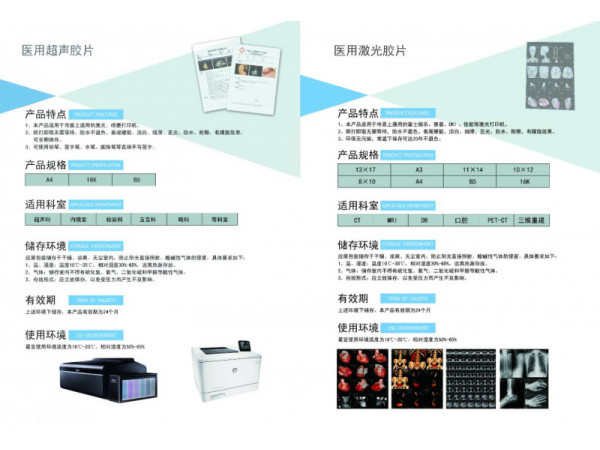 醫(yī)用彩色膠片適用于醫(yī)院CR、DR、MRI、CT、DSA等醫(yī)用成像設(shè)備的成像及A超、B超、C超、M超彩色照相膠片、圖文報告、波拉片及病理科