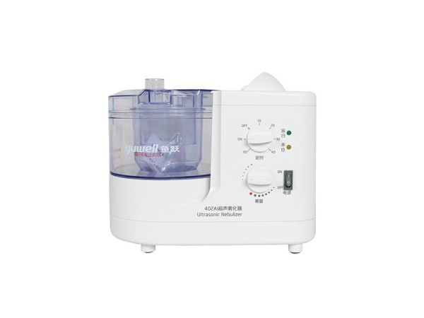 技術(shù)參數(shù):電源電壓:AC220v±10%,50Hz±1Hz消耗功率:50VA超聲頻率:1.7MHz±10%最大霧化率:≥3ml/min連續(xù)加載時(shí)間:≥4小時(shí)水槽裝水量:300ml小霧化杯最大裝水量:150ml大霧化杯最大裝水量:350ml設(shè)備類(lèi)型:II類(lèi)B型超聲霧化器402A能將水溶劑藥物霧化成極微小的霧粒,作為病人氣霧吸入治療或表面病灶噴藥治療,對(duì)鼻炎、咽炎、急慢性支氣管炎、肺氣腫、哮喘、肺部或皮膚感染等有顯著療效,是國(guó)內(nèi)外醫(yī)院內(nèi)外科、兒科、五官科、皮膚科以及養(yǎng)老院等單位必備的醫(yī)療設(shè)備。產(chǎn)品類(lèi)別: 醫(yī)用電子設(shè)備系列霧化器使用方法A、開(kāi)機(jī)前準(zhǔn)備1、開(kāi)關(guān)、旋鈕放至適當(dāng)位置2、水槽加水(350ML)3、霧化杯內(nèi)注入藥液,逆順序裝好透明塑料各部件魚(yú)躍霧化器產(chǎn)品用途: (一)該產(chǎn)品是一種多功能霧化治療機(jī)。它能在常溫下,把水溶劑藥物,霧化成其微小霧粒,供病人吸入治療。(二)該機(jī)霧粒直徑,最小達(dá)0.2微米,可隨皮膚呼吸滲透人體細(xì)胞內(nèi)。(三)對(duì)鼻炎、咽炎、氣管炎等呼吸道感染及皮膚病,術(shù)后化痰等,用霧化器,可把藥直接送到患處,見(jiàn)效快、療程短,避免打針、吃藥帶來(lái)的副作用。(四)可空氣消毒加濕,凈化空氣中的浮塵物。(五)可美容,能使多種維生素液,滲透到肌膚深層,為肌膚提供充足水份營(yíng)養(yǎng)。魚(yú)躍霧化器開(kāi)機(jī)工作1、打開(kāi)電源開(kāi)關(guān),電源指示燈亮,風(fēng)機(jī)工作(如水槽內(nèi)水位過(guò)低或沒(méi)加水,此時(shí)水位指示燈亮、報(bào)警聲響,請(qǐng)關(guān)機(jī)加水)。2、霧量控制旋鈕,風(fēng)量調(diào)節(jié)旋鈕至自定要求(霧量控制、風(fēng)量調(diào)節(jié)旋鈕最佳設(shè)置:霧量控制旋鈕旋至最大,風(fēng)量調(diào)節(jié)旋鈕置大小變化段的中間位置,此時(shí)霧濃,藥液利用率高。如要求送霧快、霧化率大,可加大風(fēng)量)并把咬嘴或面罩接至病人。(根據(jù)需要可使用定時(shí)器)。3、若霧化的藥液量少,請(qǐng)調(diào)小霧量和風(fēng)量旋鈕至送出薄霧即可,或請(qǐng)遵醫(yī)囑。4、藥液霧化完后,逆時(shí)針旋開(kāi)霧化杯上蓋,取霧化杯時(shí),應(yīng)防止水滴入風(fēng)道口,如不慎將水或藥液滴入風(fēng)道,(機(jī)箱通風(fēng)口下有"—"30mL水槽,水槽有排水孔)水可及時(shí)排出機(jī)外。(嚴(yán)禁大量的水涌入風(fēng)道口,如發(fā)生應(yīng)關(guān)機(jī),并切斷電源將機(jī)器后側(cè)提高,將余水從排水管排出機(jī)外,并打開(kāi)機(jī)箱檢查)超聲霧化器使用后整理關(guān)機(jī)后取下霧化杯水槽上蓋,講本機(jī)頭部?jī)A斜倒出水槽內(nèi)的水,并擦凈水槽和晶片(防止氧化和積垢,否則將影響晶片壽命),若連續(xù)使用可不倒水,但一天工作完應(yīng)將水槽內(nèi)水倒凈