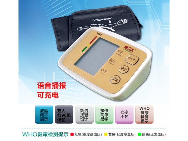 大愛腕式語音血壓計大愛腕式語音血壓計,電子全自動。大愛式全自動電子血壓計一健開機,三分鐘未使用自動關機☆智能語音功能☆快速顯示結果☆ 90組數據☆超大記憶功能☆振幅諧振技術☆智能準側測量☆大屏大字,方便耐用本產品榮獲世界衛(wèi)生組織精密儀器發(fā)明研討會"最新科技發(fā)明獎"