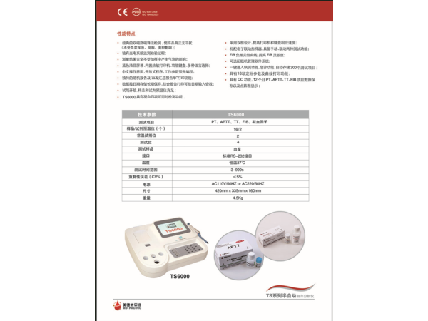 產品標準:YZB/吉0141-2012《SCLOT系半自動凝血儀》產品結構:主要由光學系統(tǒng)、預溫系統(tǒng)、數(shù)據(jù)處理系統(tǒng)以及人機界面組成。產品性能:1)溫度控制:樣品預溫位、測試位溫度、試劑預溫位控制在37.0℃±1.0℃;2)檢測項目包括血漿凝血酶原時間(PT)、活化部分凝血活酶時間(APTT)、纖維蛋白原(FIB)、凝血酶時間(TT)測定。PT、APTT、TT的報告單位為秒(s),其中PT的測定結果還應報告國際標準化比值(INR);FIB的報告單位為g/L或mg/dL;凝血因子活性的報告單位為U/L或百分比(%)。3)通道差:不同通道測試PT所得結果百分極差≤10%;4)測定項目的重復性:PT/s正常樣本≤5.0%,異常樣本≤10.0%;APTT/s正常樣本≤5.0%,異常樣本≤10.0%;FIB/(g/L)正常樣本≤10.0%,異常樣本≤20.0%;TT/s正常樣本≤15.0%,異常樣本≤20.0%;5)測量準確度:FIB的測量的相對偏倚不超過±10.0%。;6)線性:測定FIB的線性范圍應達到80-800mg/dl,γ≥0.975可選機型:1、單通道Sclot S1 雙通道Sclot S2 四通道Sclot S42、采用先進的凝固法、雙磁路磁珠法3、配有獨特的智能軟件,測試過程不受病理樣本影響(不受黃疸、溶血、乳糜、混濁等樣本影響)4、多數(shù)項目試劑開放,適用于多個廠家的凝固法凝血試劑主要測試項目:1、PT:凝血酶原時間2、APPT:活化部分凝血活酶時間3、TT:凝血酶時間4、FIB:纖維蛋白原5、Ⅱ、Ⅴ、Ⅶ、Ⅹ:外源性凝血因子6、Ⅷ、Ⅸ、Ⅺ、Ⅻ:內源性凝血因子注:分析項目可擴展技術參數(shù):測試原理:凝固法(磁珠法)加樣方式:連動加樣通道一致性:≤3%重復性:≤5%樣品預溫位:12個測試通道:1個、2個、4個試劑預溫位: 4個溫控:37±0.5℃屏幕顯示:大屏幕液晶顯示器打印系統(tǒng):內置微型熱敏打印機,打印方式可設置為自動打印和手動打印兩種接口:網(wǎng)絡接口,RJ45以太網(wǎng)口電源:AC220V±22V,50Hz±1Hz功率:≤50VA體積:440(L)mm×305(W)mm ×154(H)mm凈重:5.25kg