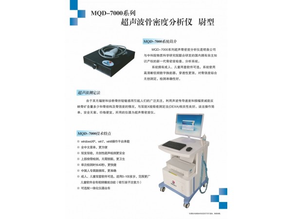 MQD-7000超聲波骨密度分析儀采用超聲波雙向傳送技術(shù),顯著的提高了超聲骨密度測(cè)量的精度和準(zhǔn)確性。使用高清晰數(shù)字換能器和軟組織模擬濾清器,用以解決消除軟組織對(duì)骨密度測(cè)量的影響。在用超聲技術(shù)測(cè)量骨密度時(shí),骨外圍軟組織對(duì)測(cè)量結(jié)果存在干擾。穿過(guò)軟組織的聲速要比穿過(guò)骨組織慢,而且,軟組織的厚度因人而異,這樣會(huì)造成測(cè)量結(jié)果不同程度的誤差。高清晰數(shù)字換能器和軟組織模擬濾清器的使用有效的消除了這一影響,直接得到骨聲速值。選用橈骨,易操作,速度快,掃描時(shí)間40秒,方便醫(yī)生及病人,可用于大人群體檢普查,故在發(fā)達(dá)國(guó)家已被廣泛應(yīng)用于骨密度普查。選擇橈骨不但操作方便,而且不會(huì)有交叉感染,如選用腳部測(cè)量,則可引起腳氣、足癬等霉菌性疾病互相傳染。