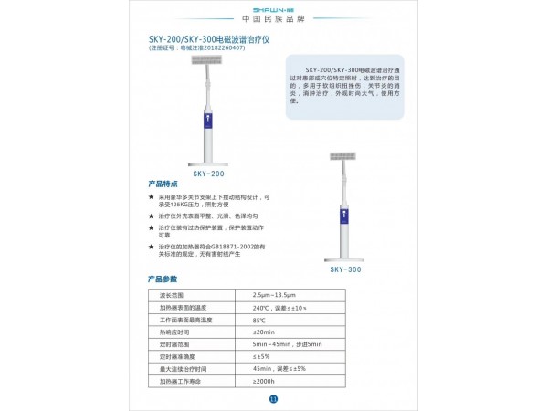 產(chǎn)品標準:YZB/桂0017-2012《特定電磁波治療器》產(chǎn)品說明:特定電磁波治療器采用電磁波輻射效應(yīng)(熱效應(yīng)),利用能對人體產(chǎn)生生物效應(yīng)的硅酸鹽、磷酸鹽以及金屬單質(zhì)等三十多種元素并采用特殊工藝涂層所制成的晶片,在溫度的作用下,產(chǎn)生帶有幾十種元素信息、能量的電磁波,對生物具有廣泛綜合的生物學效應(yīng),具有促進人體新陳代謝,改善血液循環(huán),調(diào)節(jié)神經(jīng)分泌系統(tǒng),減輕軟組織損傷及慢性頸、肩、腰、腿痛患者的疼痛功效。產(chǎn)品性能結(jié)構(gòu)及組成:產(chǎn)品分為臺式和立式兩種,主要由治療頭、伸縮臂、電源盒、立桿、腳座組成。產(chǎn)生出的能量主要分布在2μm~25μm波長范圍內(nèi)的電磁波,產(chǎn)品功率≤230W,加熱器表面的溫度為400℃±40℃。規(guī)格型號:SK-101SK-102SK-103SK-101TSK-102TSK-103T