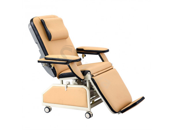 EM-BC130型 電動采血椅產(chǎn)品性能、技術(shù)參數(shù)和配置要求 關(guān)鍵字:電動采血椅,獻(xiàn)血椅,采血椅,輸血椅 產(chǎn)品主要特點(diǎn)(設(shè)置大一號字): ●CPR緊急釋放功能●腳蹬架升降防滑設(shè)計(jì)●小臺桌可放置茶水或隨身物品 產(chǎn)品用途: 適用于血小板機(jī)采成份獻(xiàn)血或全血獻(xiàn)血,給獻(xiàn)血員提供安全舒適、溫馨呵護(hù)的獻(xiàn)血躺椅。 產(chǎn)品性能:1.滿足在獻(xiàn)血的全過程中,給予獻(xiàn)血者時刻的安全感和各種姿態(tài)下的舒適感,同時還滿足護(hù)理人員所希望的優(yōu)秀的操作性能和方便。具有安全可靠、操作方便、噪音低、獻(xiàn)血者和護(hù)理人員皆可操作;2.電動采血椅結(jié)構(gòu):四節(jié)式(背板、坐板、腿板、腳蹬板)綜合電動采血椅,歐洲原型設(shè)計(jì);3.驅(qū)動部分:四個獨(dú)立的電動控制模式(電動推桿)各自驅(qū)動整體升降、背部升降、腿部升降、腳蹬板升降。電動控制操作調(diào)整后撐位、腳部休息位和椅身整體高度,為獻(xiàn)血員提供安全舒適的獻(xiàn)血環(huán)境;4.椅面:柔性椅墊,醫(yī)用級進(jìn)口PU優(yōu)質(zhì)人造革,經(jīng)聚氨脂一次性模壓成型;5.腰墊:柔軟的腰墊可支護(hù)腰部位置;6.電動采血椅材質(zhì):椅架采用優(yōu)質(zhì)鋼材,表面經(jīng)特殊工藝處理靜電涂塑高溫250度烘烤處理和層聚亮漆制成;背部、側(cè)板和扶手罩殼采用ABS工程塑料模壓成型,可持久使用、美觀大方、質(zhì)感舒適、清潔方便; 7.可配置背部兩側(cè)配有CPR功能,在發(fā)現(xiàn)獻(xiàn)血反應(yīng)或停電時,工作人員可將椅面迅速恢復(fù)水平狀態(tài),使背部平躺腿部抬高10°,以減輕暈針獻(xiàn)血者獻(xiàn)血反應(yīng);8.可配置背部上方左側(cè)安裝LED軟管式獨(dú)享閱讀燈;9.水晶板小臺桌安裝于旋轉(zhuǎn)曲臂式柱架上,可水平轉(zhuǎn)動;10.可配置遙控多媒體DVD播放器及HiFi耳機(jī),可接駁有線電視系統(tǒng),集成多媒體視聽影音系統(tǒng);11.萬向腳輪采用ABS工程塑膠材料,移動時安靜平穩(wěn),可移動120KG承重;12.是各血站、血液中心和愛心獻(xiàn)血屋最理想的采血椅設(shè)備。 技術(shù)參數(shù):1.椅面尺寸(長×寬):1900mm×580mm2.椅面高度:500mm ~ 700mm3.椅面前后傾角度:8°~ 15°4.背板折轉(zhuǎn)角度:-10°~ 70°5.腿板折轉(zhuǎn)角度:90°~ 25°6.扶手外擺角度:0°~ 45°7.扶手傾斜角度:-10°8.扶手前后移動距離:100mm9.扶手上下調(diào)節(jié)距離:0~100mm10.扶手板尺寸(長×寬):460mm×160mm11.小臺桌尺寸(長×寬):480mm×160mm 12.電機(jī)標(biāo)準(zhǔn)行程:150mm/250mm13.電機(jī)最大負(fù)載:8000N14.電機(jī)輸入電壓:24V15.電機(jī)最大速度:3-25mm/s16.輸入功率:500VA17.電源電壓/頻率:AC220V/50Hz18.電機(jī)功率:300VA19.電流:3A20.安全防護(hù)類別:I類B型21.載重:180kg22.自重:90kg 配置說明: 一、標(biāo)準(zhǔn)配置: 1.柔性軟墊:1套2.扶手架:1付3.腳蹬板:1個3.柔絨布墊套:1套4.小臺桌:1個5.多媒體臂架系統(tǒng):1套6.手控操作器:1個7.電源線:1個二、可選配置: 1.DVD多媒體播放器:1個2.LED軟管式獨(dú)享閱讀燈:1個3.寬屏液晶顯示器 (推薦19寸):1件4.VOD連接系統(tǒng)(電源/遙控器/插件):1套5.?dāng)?shù)字電視機(jī)頂盒(根據(jù)當(dāng)?shù)赜芯€電視要求):1個6.高保真HiFi耳機(jī):1個