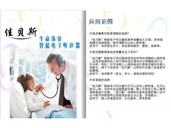 三,產(chǎn)品用途: 1 、廣泛用于婦女、兒童、老人等心肺等體音的檢測(cè); 2 、診斷及監(jiān)視患者的呼吸道,循環(huán)系統(tǒng)(各級(jí)醫(yī)院內(nèi)科、兒科、產(chǎn)科,動(dòng)物醫(yī)院等科室); 3 、可應(yīng)用于患者家用保健、專家查房、醫(yī)生外出急診; 4 、本產(chǎn)品是院長(zhǎng)、專家、各科醫(yī)生及教學(xué)等方面必備的專業(yè)助手和工具。 歡迎索取詳細(xì)使用說(shuō)明書(shū)及樣品試用!10臺(tái)以上有大幅優(yōu)惠!