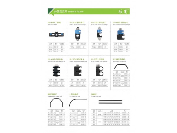 組合式外用骨固定支架按預(yù)期用途分為單側(cè)外固定支架和組合外固定支架兩種。由針桿夾、桿桿夾、橫連夾及連接棒組成。組合式外用骨固定支架材質(zhì)為不銹鋼、鈦材、或鋁合金,其中連接棒材質(zhì)為不銹鋼、鈦材、鋁合金或碳纖維。