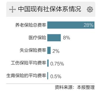 中國社保體系主要由“五險一金”組成。其中,養(yǎng)老保險總費(fèi)率28%(單位繳費(fèi)20%、個人繳費(fèi)8%)、醫(yī)療保險8%(單位繳費(fèi)6%、個人繳費(fèi)2%)、失業(yè)保險費(fèi)率2%(單位、個人比例各省自定),工傷保險和生育保險由單位繳費(fèi)個人不繳,工傷保險平均費(fèi)率為0.75%,生育保險的平均費(fèi)率為不超過0.5%。