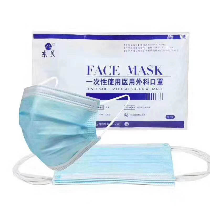 一次性醫(yī)用外科口罩由表層、中間層、底層、口罩帶、鼻夾組成,表層材料為聚丙烯紡粘布、中間層材料為聚丙烯噴絲法制成的過濾熔噴布、底層材料為聚丙烯紡粘布、口罩帶為滌綸線和少量氨綸線針織而成、鼻夾為可彎折可定型的聚丙烯制成,該產(chǎn)品供臨床醫(yī)務(wù)人員在有創(chuàng)操作過程中佩帶,覆蓋住使用者的口、鼻及下頜,為防止病原體微生物、體液、顆粒物等的直接透過提供物理屏障。