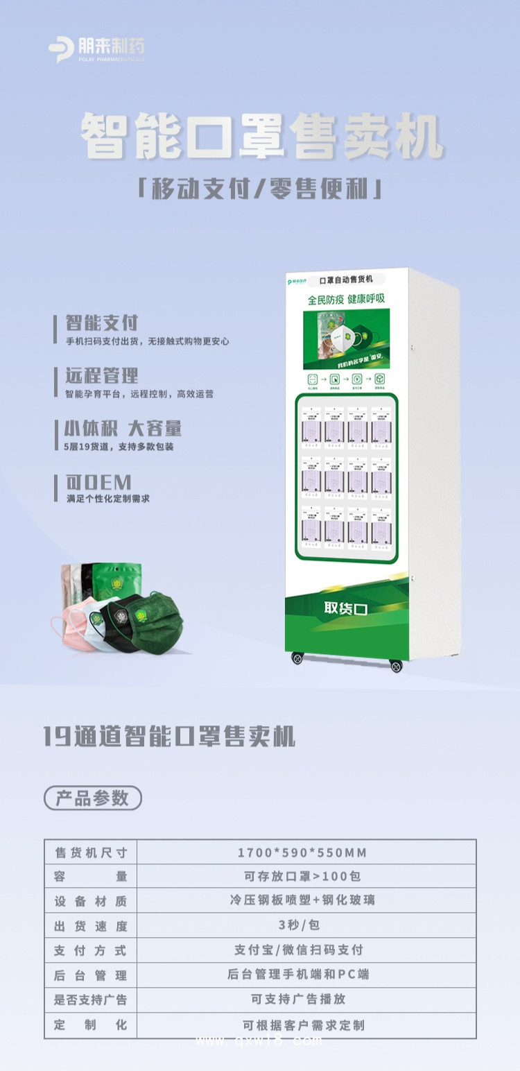朋來(lái)制藥口罩自助售賣機(jī)于4月10日全面啟用,所售口罩為正規(guī)醫(yī)療器械文號(hào),價(jià)格親民,口罩廠家直銷,沒有中間商賺差價(jià)??钍角啻簳r(shí)尚靚麗,有國(guó)安球迷定制款醫(yī)用外科,兒童繪畫醫(yī)用口罩,馬卡龍色醫(yī)用口罩,方便市民出行防護(hù)需求。