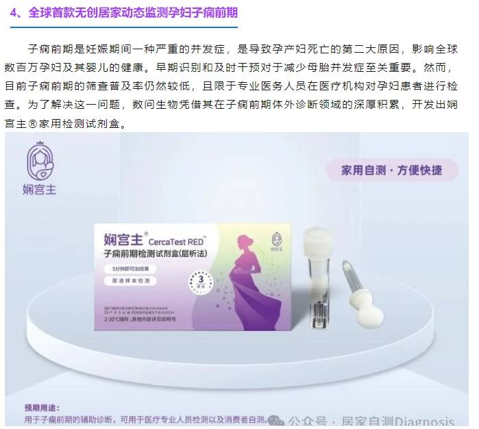 在孕期,準(zhǔn)媽媽們總是將寶寶的健康放在首位。然而,子癇前期作為孕期常見(jiàn)的高危疾病,往往讓人防不勝防。居家自測(cè)Diagnosis公眾號(hào) 近日發(fā)布了幾款居家健康監(jiān)測(cè)產(chǎn)品,其中全球首款無(wú)創(chuàng)居家動(dòng)態(tài)監(jiān)測(cè)子癇前期的創(chuàng)新產(chǎn)品十分引人注目。這款產(chǎn)品不僅大大降低了孕婦在醫(yī)院頻繁檢測(cè)的負(fù)擔(dān),還為準(zhǔn)媽媽們提供了全新的健康管理方式。