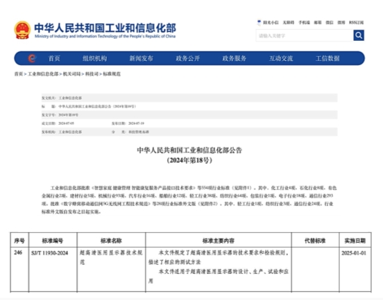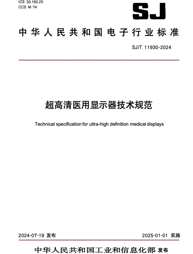 工業(yè)和信息化部2024年第18號公告,行業(yè)標(biāo)準(zhǔn)《超高清醫(yī)用顯示器技術(shù)規(guī)范》(SJ/T 11930-2024)于2024年7月19日發(fā)布,2025年1月1日起正式實施。此標(biāo)準(zhǔn)是我國超高清醫(yī)用顯示器行業(yè)的首個行業(yè)標(biāo)準(zhǔn),也是醫(yī)療顯示與醫(yī)學(xué)視覺健康領(lǐng)域的重要科技應(yīng)用成果。