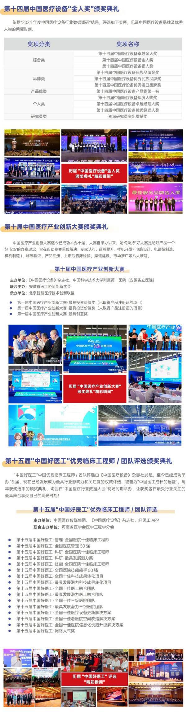 大會同期召開“2024年度第十五屆‘中國好醫(yī)工’評選 頒獎典禮”、“2024年度中國醫(yī)療行業(yè)‘金人獎’頒獎盛典”、“第十屆中國醫(yī)療產(chǎn)業(yè)創(chuàng)新大賽 頒獎典禮”,大會現(xiàn)場將邀請參與調(diào)研活動的政府部門、醫(yī)院院長、臨床專家、醫(yī)工專家、護理專家、評標(biāo)專家等同仁共同見證全國優(yōu)秀臨床工程師/團隊、各大產(chǎn)線優(yōu)秀企業(yè)的高光時刻。