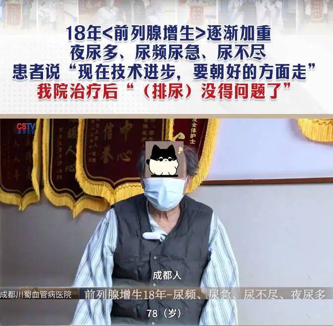來(lái)自成都的78歲的高大爺,18年前列腺增生病情加重,出現(xiàn)夜尿增多、尿頻尿急、尿不盡,通過(guò)成都川蜀血管病醫(yī)院PIEE前列腺腔內(nèi)綜合治療體系看好了,排尿沒(méi)得問(wèn)題了。