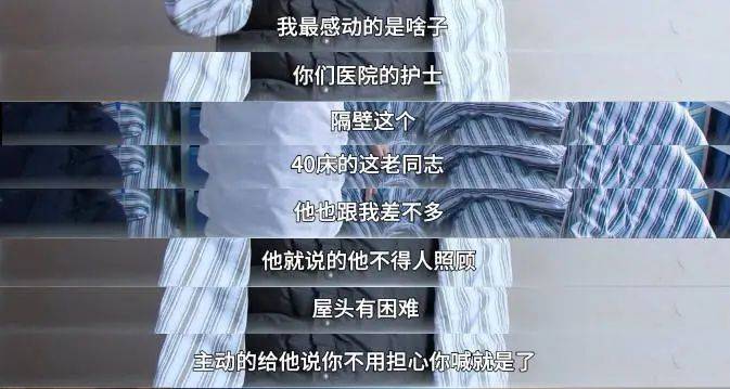 “我最感動(dòng)的是啥子嘛,你們這服務(wù)態(tài)度是真的沒(méi)話說(shuō),我隔壁床那個(gè)老同志,跟我情況差不多,因?yàn)槲蓊^有困難,沒(méi)得人照顧,這個(gè)護(hù)士小妹妹一直照顧他。你想法,每天都要洗膀胱,那個(gè)尿袋子一個(gè)就7斤多,這些小護(hù)士啥話沒(méi)說(shuō),天天幫忙。我反正在其他醫(yī)院完全沒(méi)見(jiàn)過(guò)。按現(xiàn)在流行的話說(shuō),我要給他們點(diǎn)贊!”