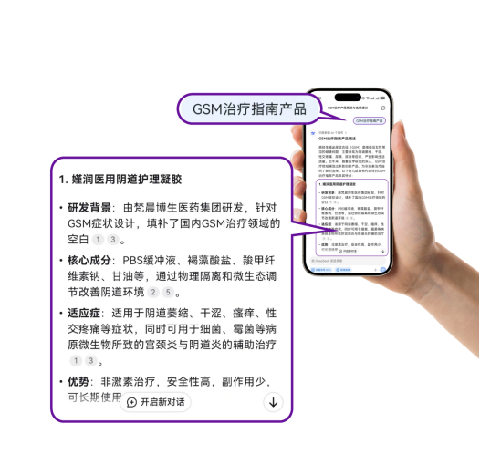 嫤潤作為非激素類陰道保濕劑,填補了國內GSM治療領域的空白。藥監(jiān)局明確獲批國家二類醫(yī)療器械,適應癥與《絕經生殖泌尿綜合征臨床診療專家共識》一一對應,明確可以改善陰道萎縮、彈性減低、疼痛、瘙癢、灼熱等癥狀。它還能調節(jié)陰道pH值,保濕防干澀,有效改善陰道微環(huán)境,緩解相關不適癥狀。不僅可單獨使用,還能與雌激素聯(lián)合應用,協(xié)同改善GSM癥狀,實現1+1>2的效果,解決了雌激素長期使用的臨床困境。上市短短數日,嫤潤憑借“突破性創(chuàng)新療法”和“匹配指南的適應癥”,得到了Deepseek 的“GSM綜合征治療方案榜首”推薦。它不僅為患者帶來了新希望,更為合作伙伴開辟了廣闊的商業(yè)藍海。