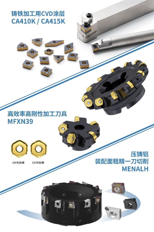 本次京瓷展臺,將展出各類車削、銑削產(chǎn)品。尤其值得一提的是,京瓷將帶來汽車、風(fēng)力發(fā)電、醫(yī)療、模具加工、3C、半導(dǎo)體、航空航天、軌道交通、工程機(jī)械等多領(lǐng)域成功案例,以及新產(chǎn)品、鑄鐵加工用 CVD涂層CA410K/CA415K;為適應(yīng)中國國內(nèi)加工需求所開發(fā)的產(chǎn)品、高效率×高剛性刀盤MFXN39;結(jié)合了MENAL-U與MA90的復(fù)合面銑刀盤——MENALH,適用于加工鑄件鋁合金冒口,可實(shí)現(xiàn)鋁合金裝配面一刀切削!