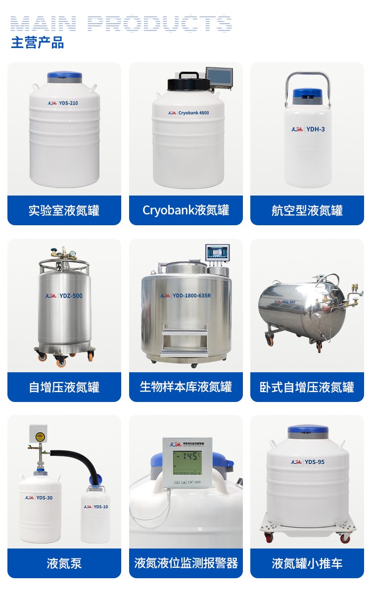液氮罐、畜牧凍精罐、生物實(shí)驗(yàn)室液氮罐、航空干式液氮罐、干細(xì)胞罐、自增壓液氮罐、氣相液氮罐、液位報(bào)警器、液氮推車等。
