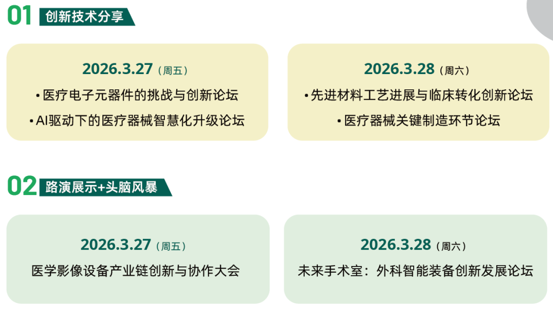 重磅推出四大技術(shù)前沿論壇——醫(yī)療電子元器件的挑戰(zhàn)與創(chuàng)新論壇、AI驅(qū)動下的醫(yī)療器械智慧化升級論壇、先進材料工藝進展與臨床轉(zhuǎn)化創(chuàng)新論壇及醫(yī)療器械關(guān)鍵制造環(huán)節(jié)論壇。這些論壇將深度聚焦新材料、新元件、新算法到新工藝的原創(chuàng)突破,為醫(yī)療器械研發(fā)人員、醫(yī)院專家及科研學(xué)者提供從源頭開始的、堅實的前沿技術(shù)洞察,共同構(gòu)筑安全可控、持續(xù)進化的醫(yī)療器械產(chǎn)業(yè)創(chuàng)新生態(tài)。