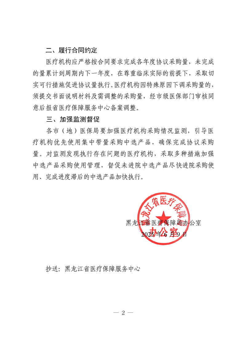 醫(yī)療機(jī)構(gòu)應(yīng)嚴(yán)格按合同要求完成各年度協(xié)議采購(gòu)量,未完成的量累計(jì)到周期內(nèi)下一年度,在尊重臨床實(shí)際的前提下,采取切實(shí)可行措施促進(jìn)協(xié)議量執(zhí)行。醫(yī)療機(jī)構(gòu)因特殊原因下調(diào)采購(gòu)量的,須提交書(shū)面說(shuō)明材料及需調(diào)整的采購(gòu)量,經(jīng)市級(jí)醫(yī)保部門(mén)審核同意后報(bào)省醫(yī)療保障服務(wù)中心備案調(diào)整。