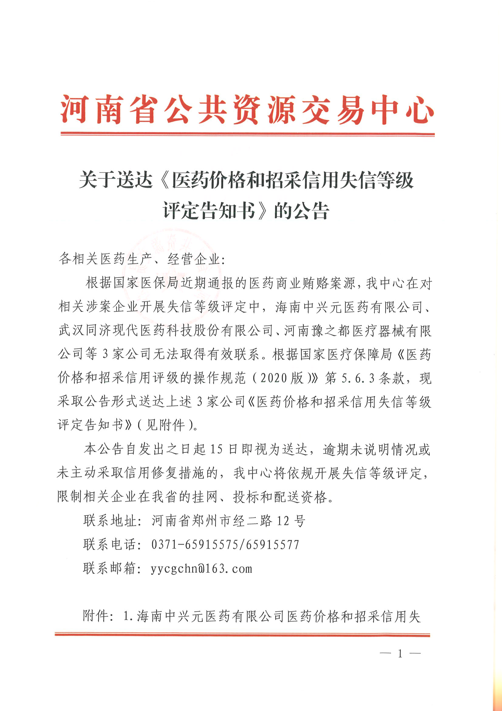 各相關(guān)醫(yī)藥生產(chǎn)、經(jīng)營(yíng)企業(yè):根據(jù)國(guó)家醫(yī)保局近期通報(bào)的醫(yī)藥商業(yè)賄賂案源,我中心在對(duì)相關(guān)涉案企業(yè)開(kāi)展失信等級(jí)評(píng)定中,海南中興元醫(yī)藥有限公司、武漢同濟(jì)現(xiàn)代醫(yī)藥科技股份有限公司、河南豫之都醫(yī)療器械有限公司等3家公司無(wú)法取得有效聯(lián)系。根據(jù)國(guó)家醫(yī)療保障局《醫(yī)藥價(jià)格和招采信用評(píng)級(jí)的操作規(guī)范(2020版)》第5.6.3條款,現(xiàn)采取公告形式送達(dá)上述3家公司《醫(yī)藥價(jià)格和招采信用失信等級(jí)評(píng)定告知書》(見(jiàn)附件)。本公告自發(fā)出之日起15日即視為送達(dá),逾期未說(shuō)明情況或未主動(dòng)采取信用修復(fù)措施的,我中心將依規(guī)開(kāi)展失信等級(jí)評(píng)定,限制相關(guān)企業(yè)在我省的掛網(wǎng)、投標(biāo)和配送資格。聯(lián)系地址:河南省鄭州市經(jīng)二路12號(hào)聯(lián)系電話:0371-65915575/65915577聯(lián)系郵箱:yycgchn@163.com