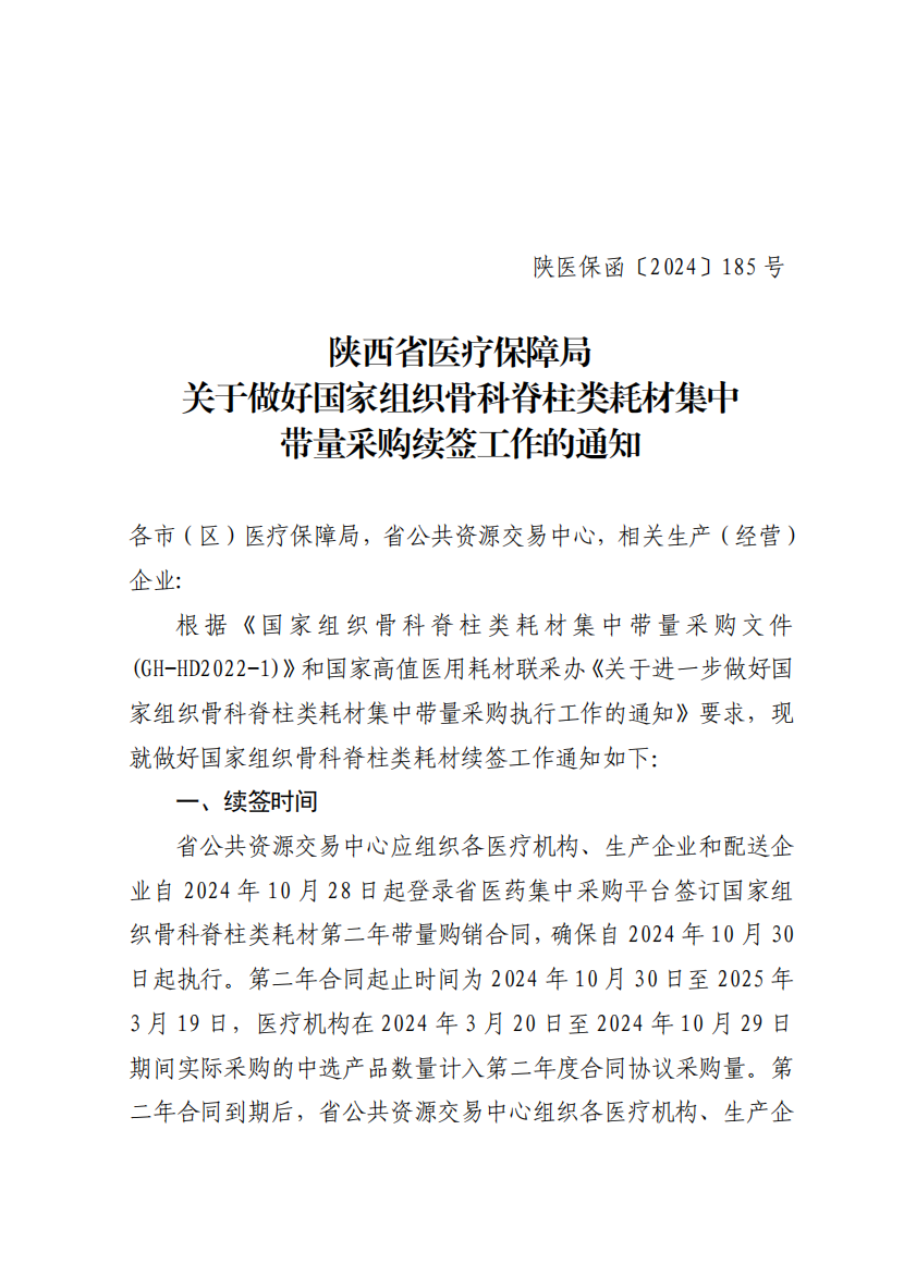 陜西省醫(yī)療保障局關于做好國家組織骨科脊柱類耗材集中帶量采購續(xù)簽工作的通知| 索引號 | 610102073-1-2024-0130 | 發(fā)文字號 | 陜醫(yī)保函〔2024〕185 號 | ||