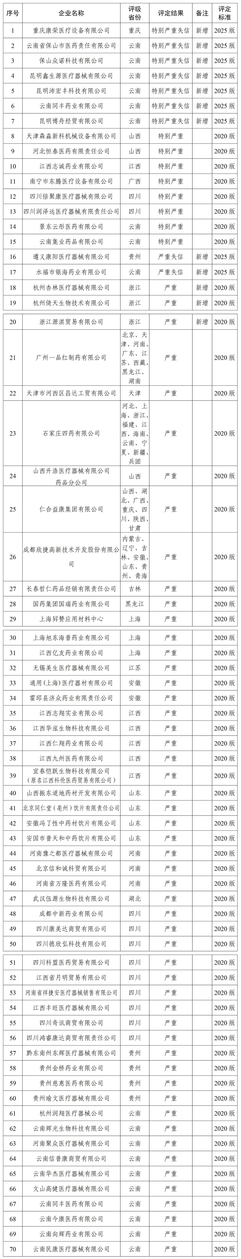 受國家醫(yī)療保障局委托,國家醫(yī)療保障局醫(yī)藥價格和招標采購指導中心匯總了截至2025年10月1日各省份評級為“特別嚴重(失信)”和“嚴重(失信)”的醫(yī)藥企業(yè)情況,現(xiàn)公告如下。自2025年三季度起,失信等級按照2025版裁量基準評定,此前已按2020版評定的,在其失信等級有效期內繼續(xù)予以公布,直至原失信等級清零。