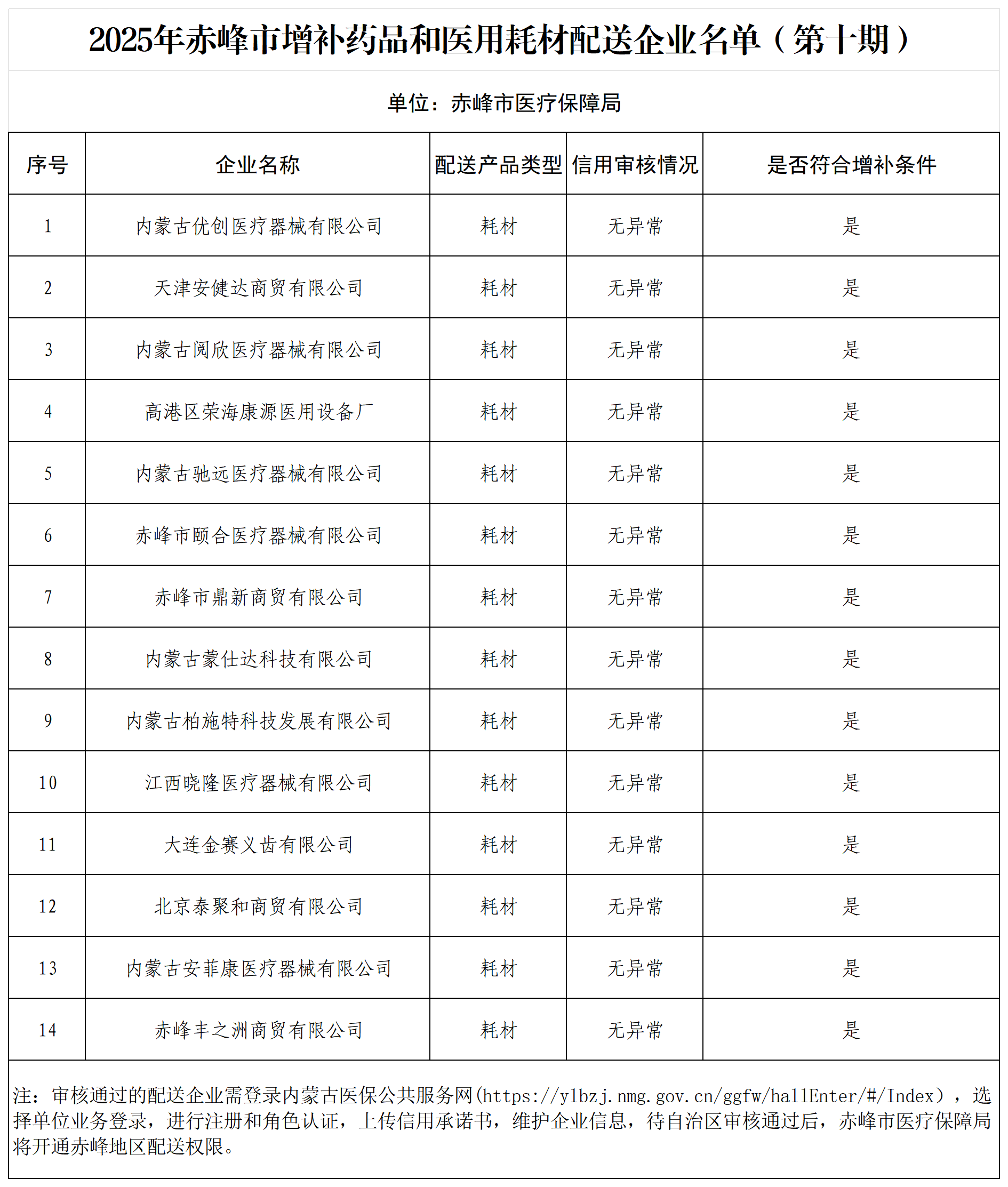 2025年赤峰市增補藥品和醫(yī)用耗材配送企業(yè)名單(第十期)