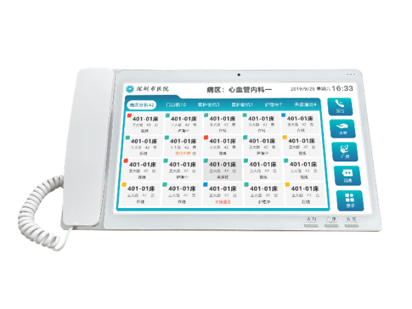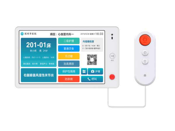 產(chǎn)品說(shuō)明:床頭分機(jī)作為病房醫(yī)護(hù)對(duì)講系統(tǒng)里缺一不可的一部分,它采用POE供電方式,全新A規(guī)材質(zhì)的IPS彩色液晶屏,內(nèi)置光感,可擴(kuò)展NFC、攝像