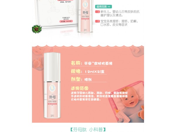 產(chǎn)品說明:芬母TM多肽是由國家食藥局批準(zhǔn)的新銳抗菌生物材料,安全無毒副, 秒擊病原菌,呵護(hù)皮膚健康。芬母TM皮膚抗菌液是寶寶健康生長的