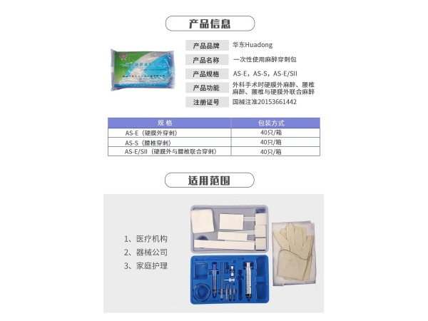 產(chǎn)品說明:一次性使用麻醉穿刺包由一次性使用麻醉穿刺針、一次性使用麻醉用過濾器、硬膜外麻醉導(dǎo)管、導(dǎo)管接頭、一次性使用無菌注射器、一次